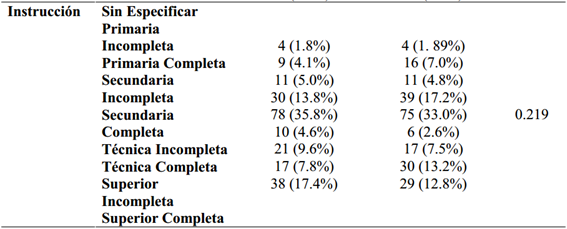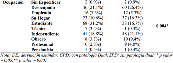 Dentro del grupo de consumidores de sustancias, el 49.0% presentó algún otro diagnóstico comórbido o patología dual, mientras que un 51.0% no lo presentó. Como se muestra en la tabla 1., la edad promedio del grupo CPD fue de 31.45 años (DE = 15.59), y de 33.93 (DE = 15.48) para el grupo sin patología dual; entre ambos no se encontraron diferencias significativas para la edad (p=0.093), así como para la división en rangos de las edades (p=0.543), para el estado civil (p=0.265), y el nivel de instrucción (p=0.219). Se encontraron diferencias estadísticamente significativas para la distribución del sexo (p.e. 39.9% vs 61.2% en varones, p<0.001, con mayor presencia de mujeres en el grupo CPD. También se encontraron diferencias para el tipo de ocupación anterior al ingreso de los pacientes (p.e. 31.2% vs 17.6% de estudiantes, p<0.004).