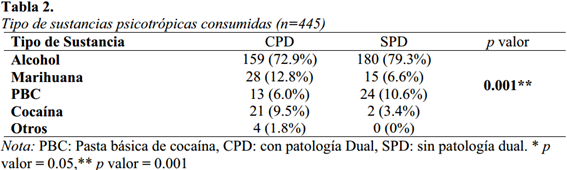 Respecto al tipo de sustancias que consumen los pacientes CPD y SPD, se muestra en la tabla 2. Se puede observar que para ambos grupos, el alcohol es la droga más consumida (CPD-72.9% ySPD-79.3%), siendo la marihuana y el PBC (que suelen consumirse juntas), las siguientes más consumidas (CPD-18.8% y SPD-16.6%), se encontraron diferencias estadísticamente significativas entre ambos grupos (p<0.001); donde el grupo CPD consume mayores sustancias psicotrópicas. Sobre los trastornos mentales presentes, la mayoría de pacientes SPD tienen un diagnóstico de dependencia a dichas sustancias (F 1X.2) según el CIE-10 (OMS, 2004).