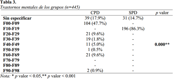 En el grupo CPD (véase la tabla 3), se puede observar una prevalencia del 47.7% para los trastornos mentales orgánicos, incluidos los somáticos, un 9.6% para la esquizofrenia, trastorno esquizotípico y los trastornos delirantes; además se observa que los trastornos de personalidad (particularmente el trastorno límite de personalidad y trastorno disocial de personalidad), una prevalencia del 9.6%. En el grupo SPD, un el 86.3% ha sido diagnosticado por un trastorno mental y del comportamiento debido al consumo de sustancias y un 14.7% sin especificación clara al consumo de sustancias.