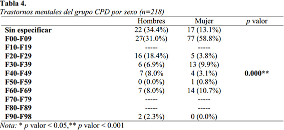 Sobre las diferencias de sexo según el trastorno mental para el grupo CPD (tabla 4), se observan diferencias estadísticamente significativas entre ambos grupos (p <0.001). Se muestra que un 31% de los hombres, y un 58.8% de las mujeres presentan un trastorno mental orgánico, incluidos los somáticos; un 18.4%de los hombres y un 3.8% de las mujeres presentan esquizofrenia, trastorno esquizotípico y trastornos delirantes. Además, se observa que el 9.9% de las mujeres y un 6.9% de los hombres sufren de trastornos del humor (afectivos), también un 8% de los hombres presentan un trastorno de personalidad de tipo antisocial, y un 10.7% de las mujeres, presentan un trastorno de personalidad límite.