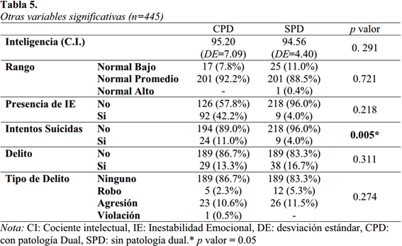 Respecto a otras variables significativas (véase en la tabla 5), se encontró que el cociente intelectual de 95.20 (DE=7.09) para el grupo CPD y de 94.56 (DE=4.40), no encontrándose diferencias entre ambos. Sobre la presencia de inestabilidad emocional como una variable cínica significativa que origina mayor deterioro en las relaciones interpersonales, el 42.2% del grupo CPD y el 4% del grupo SPD lo presentaron, sobre los intentos suicidas, un 11 % del grupo CPD y un 4% del SPD tuvieron intentos suicidas, encontrándose diferencias estadísticamente significativas entre ambos (P<0.005), es decir, los sujetos CPD serían más proclives a mayores intentos suicidas. Por otro lado, 29% del grupo CPD realizó algún delito (agresión 10.6%, y robo 2.3%) al igual que el 16.7% del grupo SPD (agresión 11.5% y robo 5.3%), no se encontraron diferencias significativas.