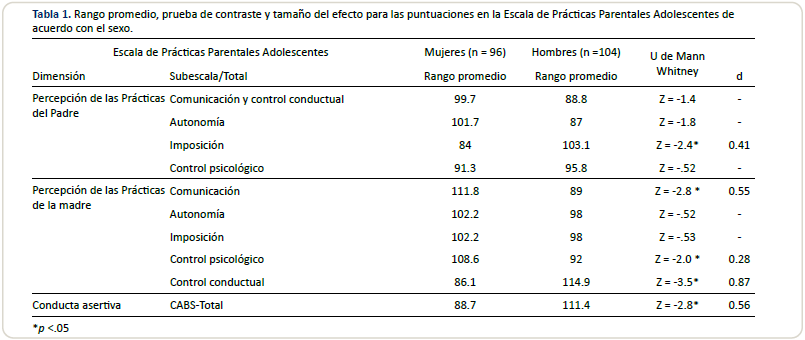 En cuanto a la percepción de las prácticas parentales, en la Tabla 1, se puede observar que hay diferencias estadísticamente significativas entre hombres y mujeres en la percepción de: Imposición paterna con mayor rango promedio en los hombres (z = -.2.4, p < .05), con un tamaño del efecto mínimo recomendado para significancia práctica; Comunicación materna (z = -.2.8, p < .05), con un tamaño de efecto mediano; Control Psicológico materno (z = -.2.0, p <.05), con un tamaño del efecto mínimo recomendado para significancia práctica; y en Control Conductual materno (z = -.3.5, p <.05), con un tamaño de efecto grande, en estas tres últimas comparaciones.