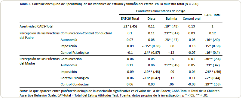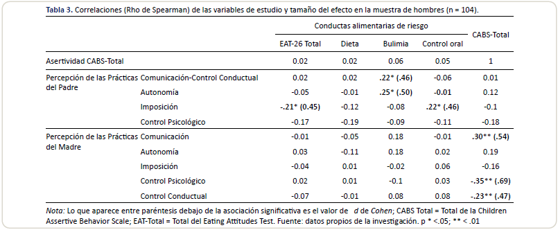 En la Tabla 2 se observan las asociaciones entre las variables de estudio: EAT-26-Total y sus tres subescalas (Dieta, Bulimia/Preocupación por la Comida y Control Oral), con el CABS-Total, así como con las nueve subescalas de la EPP-A (cuatro hacia el padre y cinco hacia la madre) en la muestra total. Respecto a la asociación entre el EAT-26-Total y sus subescalas (muestra total), sólo fue significativa y moderada con el CABS-total (rs = .21). En cuanto a las tres subescalas del EAT-26: la de Dieta se asoció débil y negativamente con Imposición (paterna y materna; rs = -.15, -.19, respectivamente) y con Control Psicológico (paterno y materno; rs = -.14, -.18, respectivamente); en tanto que, la subescala de Bulimia se asoció débil y positivamente con el CABS-total (rs = .19), así como con Comunicación-Control Conductual paterna (rs = .23) y con Autonomía paterna y materna (rs = .23, .21, respectivamente). Los tamaños del efecto para las asociaciones significativas, fluctuaron entre débiles y moderados. Cabe destacar que, Control Oral no se asoció significativamente con ninguna de las variables de estudio.