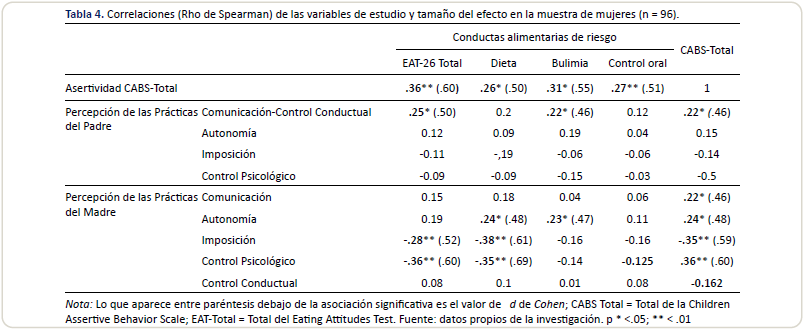 Con el propósito de evaluar la asociación entre las variables del estudio de acuerdo con el sexo, se calcularon las correlaciones de manera independiente para hombres y para mujeres. En la tabla 3 se observan las asociaciones para los hombres y en la Tabla 4 para las mujeres. Como se puede observar, en la muestra de hombres, se encontró un menor número de asociaciones significativas en comparación con las mujeres (7 vs. 19, respectivamente). En la muestra de hombres, el EAT-26-Total sólo se asoció débil y negativamente con Imposición paterna (rs = -.21); la subescala Dieta no se asoció significativamente con ninguna de las variables de estudio; mientras que, la subescala Bulimia se asoció débil y positivamente con Comunicación y Autonomía paterna (rs = .22, .25, respectivamente); Control Oral sólo se asoció débil y positivamente con Imposición paterna (rs = .22; ver tabla 3). En cuanto al CABS-Total, este presentó asociaciones sólo con algunas de las variables de percepción de prácticas de la madre, asociándose positivamente con Comunicación y con Control Psicológico, pero negativamente con Control Conductual (rs = .30, .35, y -.23, respectivamente). Los tamaños del efecto para las asociaciones significativas, fluctuaron entre débiles y moderados.