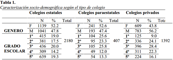 Para este estudio se tomó una muestra de 4200 estudiantes de 89 instituciones educativas de la Dirección Regional de Educación de la provincia de Arequipa, matriculados en el año 2012, quedando como muestra final, luego de eliminar las pruebas inconsistentes, un total de 3979 estudiantes, de los cuales 1962 son mujeres y 2017 son varones. Divididos por el tipo de colegio en: 2180 alumnos de colegios estatales, 1392 de colegios particulares y 407 de colegios paraestatales (véase Tabla 1), los mismos que están matriculados del 1º al 5º grado de educación secundaria, cuyas edades oscilan entre los 11 a 19 años (M=14.41), todos ellos de diferentes niveles socioeconómicos. Para asegurar la representatividad de la muestra, se empleó un muestreo probabilístico polietápico estratificado por afijación proporcional. Se tuvo en cuenta el tamaño de la población estudiantil de cada distrito, tipo de institución educativa (pública, privada y paraestatal), grado (primero a quinto) y sexo (varones y mujeres).