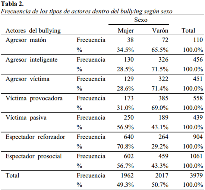 En cuanto a los tipos de actores dentro del bullying, los varones tienen una mayor tendencia de ser agresor o víctima provocadora, por presentar actitudes más permisivas hacia la agresión que sus pares mujeres, resultados similares a los encontrados por diversos autores (Ortega & Mora-Merchán, 2000; de la Villa Moral, 2005; Garaigordobil & Oñederra, 2009). Por otro lado, las mujeres tienen mayor tendencia a ser espectadoras, ya que no tienden a involucrarse de forma activa dentro del bullying a diferencia de varones (Oliveros & Barrientos, 2007; Carozzo, 2010).