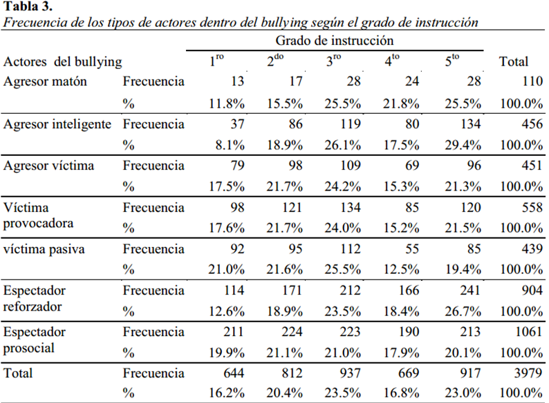 En cuanto a los actores del bullying según el grado de instrucción observamos en la Tabla 3 que la frecuencia de agresores matones se incrementa en los años superiores llegando al 25.5% en el 3er y 5º año de secundaria, posiblemente por sentirse con mayor fortaleza física y ansia de poder. También la frecuencia de agresores inteligentes aumenta en función del avance académico, la mayoría cursan 5º grado de secundaria (29.4%). Y la frecuencia de agresores víctimas es fluctuante, siendo mayor en el 3er grado de secundaria (24.2%). La frecuencia de victimización nos muestra que la cantidad de víctimas pasivas decrece a medida que aumenta el grado escolar; en cambio, el número víctimas provocadoras es fluctuante, con picos elevados en 2º, 3er y 5º grado de secundaria. Pero ambas formas de victimización se dan con más frecuencia en el 3er grado de secundaria (25.5% y 24.0%, respectivamente). Los espectadores reforzadores tienden a aumentar al llegar a grados superiores, con un mayor porcentaje en 5to de secundaria (26.7%) mientras que, el espectador prosocial es ligeramente más frecuente en los primeros años de secundaria.