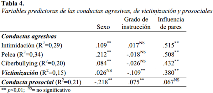 Al elaborar un modelo predictivo de las conductas ligadas al bullying, ya sean estas agresivas, de victimización o prosociales, encontramos que la influencia de las actitudes de los pares transgresores de normas llega a predecir las conductas agresivas de los adolescentes evaluados; tengamos en cuenta que el nivel de identificación con el grupo está directamente relacionado con la intimidación, cuando el contexto normativo del grupo permite la expresión de este tipo de comportamiento (Bustillos, Ferrero, Gaviria, & Morales, 2008) sumado a la tendencia de considerar superiores los valores del propio grupo que los valores inculcados por los adultos (Díaz-Aguado, Martínez, & Martín, 2004). También, encontramos que los varones son más propensos a las conductas agresivas, resultado que corrobora lo mencionado por Carozzo (2010).