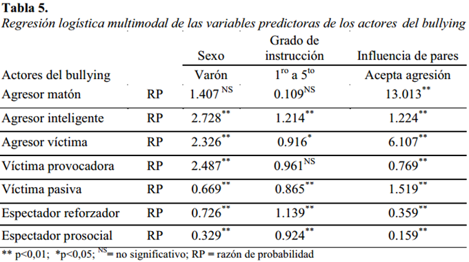 La Tabla 5 muestra que la influencia de pares transgresores de normas incrementa considerablemente la probabilidad de ser un agresor matón (RP= 13.01), de ser agresor víctima (RP= 6.10) y en menor medida de ser agresor inteligente (RP= 1.22), además los varones son más proclives de ser agresores inteligentes (RP = 2.78) o de ser agresores víctimas (RP = 2.32), de la misma forma el cursar los grados superiores de secundaria incrementa la probabilidad de ser un agresor inteligente (RP= 1.24); pero reduce la probabilidad de ser agresor victima en un 9%.