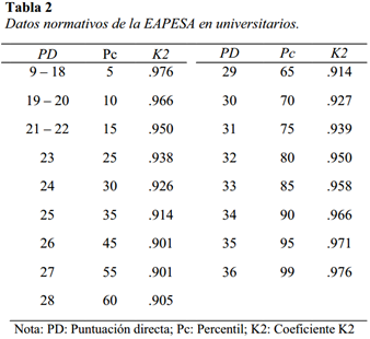 El uso de la EAPESA ha estado restringido a estudios instrumentales o empíricos, pero hasta la fecha no se había planteado la posibilidad de elaborar baremos para ser usados con fines de tamizaje en evaluaciones masivas. Por ello, los resultados del presente estudio tuvieron como objetivo principal la elaboración de datos normativos que permitan establecer un punto de corte para identificar a estudiantes universitarios con baja AA.