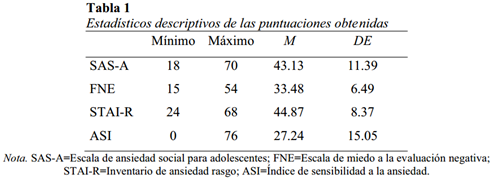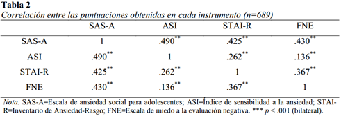 Todas las variables correlacionaron entre sí de forma significativa (p<.001), considerándose niveles bajos a los coeficientes menores a .40 y moderados entre .40 y .60 (Morris & Maisto, 2001). Las correlaciones entre la SAS-A con la ASI, el STAI-R y la FNE fueron moderadas, sin embargo, las correlaciones entre la ASI con el STAI-R y la FNE fueron bajas, así como entre el STAI-R y la FNE (Tabla 2).