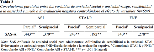 Las contribuciones propias de la sensibilidad a la ansiedad, del rasgo de ansiedad y del miedo a la evaluación negativa en la ansiedad social se investigaron con el cálculo de las correlaciones parciales entre SAS-A y cada una de las demás variables, controlándose el efecto de las restantes. Además de la correlación de orden cero y la correlación parcial de cada una de las variables predictoras con ansiedad social, se calculó la correlación semiparcial. Todas las correlaciones fueron positivas y significativas, siendo la de mayor magnitud la encontrada entre ansiedad social y sensibilidad a la ansiedad (Tabla 3).