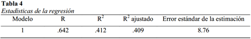 Morales Vallejo (2012, p.14) afirma que la correlación múltiple ajustada (R2 ajustada) es “una estimación de R2 en la población, no en la muestra”, y también expresa que el ajuste no es importante con muestras mayores a 100 y menos de 5 predictores. Se encontró un coeficiente de correlación R2 ajustado igual .409.