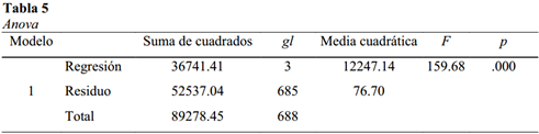 La validación del modelo predictivo se realizó con la prueba de varianza ANOVA (Tabla 5) la cual indica si la varianza explicada por la regresión es significativamente distinta y mayor a la varianza no explicada. El modelo global fue estadísticamente significativo (F=159.68; p=.000), es decir, el modelo mejora significativamente la predicción de la ansiedad social y permite suponer la existencia de un efecto real de las variables predictoras sobre la variable dependiente.