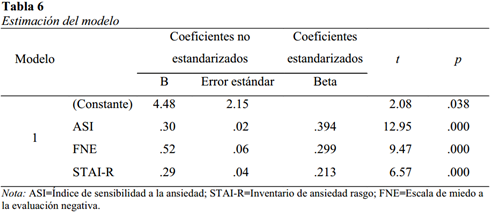 Para los coeficientes del modelo de regresión, las puntuaciones t indican que las variables tenidas en cuenta aportan significativamente al modelo de predicción o que los valores obtenidos se pueden generalizar a la población. En este estudio, las variables independientes sensibilidad a la ansiedad (t=12.95; p=.000), miedo a la evaluación negativa (t=9.47; p=.000) y ansiedad rasgo (t=6.57; p=.000) aportan significativamente al modelo predictivo de ansiedad social (Tabla 6). La variable que tiene más peso en el modelo es la sensibilidad a la ansiedad ya que es la que presenta mayor coeficiente estandarizado (β=.394; p=.000), siguiendo en orden el miedo a la evaluación negativa (β=.299; p=.000) y finalmente el rasgo de ansiedad (β=.213; p=.000).