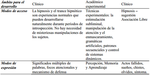Se pudo concluir que existe una diferencia en lo que respecta al ámbito en la cual se desarrolló el término, siendo clínico en Erickson y Freud y académico-experimental en Froufe. También es importante destacar que la popularidad del inconsciente es notable en Freud, en el caso de Erickson es menor comparativamente hablando, pero no ocurre lo mismo con el inconsciente cognitivo, debido a que su formulación es de reciente aparición y aún no cuenta con desarrollos clínicos, sino más bien experimentales.