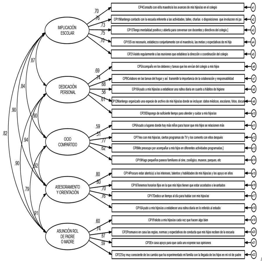 asesoramiento y orientación y asunción rol de padre o madre. Resultados: Se obtuvo un ajuste adecuado al modelo de cinco factores, X2