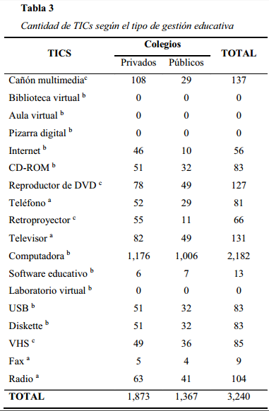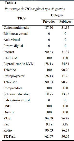 En nuestro estudio se ha evidenciado lo antes dicho, de modo que el 50.65% de los colegios de gestión pública poseen todo un paquete de TICs (computadoras equipadas con CD-ROM, USB, Diskette, internet además de cañón multimedia, software educativo, y otras tecnologías como reproductor de DVD, retroproyector, televisor, teléfono, fax y radio) en comparación con el 62.67% de colegios de gestión privada. Ciertamente el acceso a las TICs en ambos tipos de gestión es menor del que debiera. Y aunque la diferencia entre los colegios públicos y privados parece ser pequeña, si se comparan las cantidades de TICs, (1,367 unidades en la gestión pública y 1,873 en la gestión privada) de los colegios de nuestra muestra, podrá notarse que el acceso a la tecnología educativa en los colegios públicos es mucho menor que en los colegios privados.