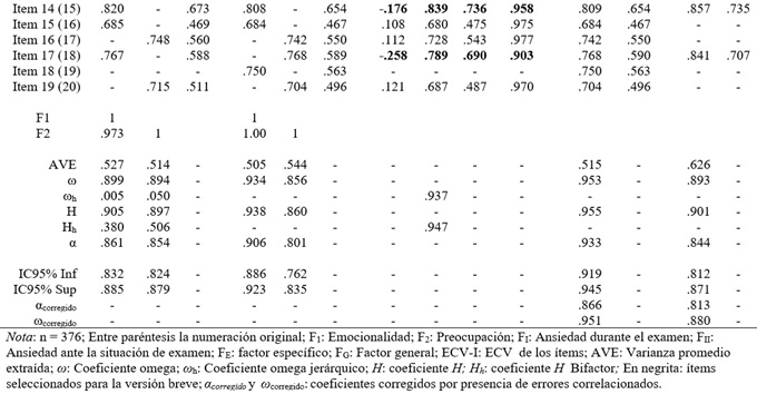 Fue analizada la pertinencia de correlacionar errores tomando como referencia los IM. En base a los resultados, es conveniente relacionar los errores de los ítems 7 (Me siento muy agitado mientras contesto un examen importante) y 17 (Siento que el corazón me late muy rápidamente durante los exámenes muy importantes). La presencia de la correlación entre errores no mejora sustancialmente los índices de ajuste (SB-χ²[151] = 1.864 [p = .761]; CFI = 1.000; RMSEA [IC 90%] = .000 [.000, .053]; SRMR = .011), aunque debido a su magnitud (Φ7,17 =.126; p < .05) fue considerada para efectuar las correcciones a los coeficientes α y ω (Tabla 2).