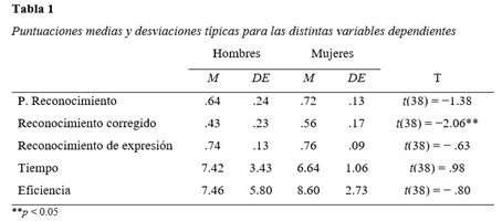 Para comprobar la existencia de diferencias significativas entre hombres y mujeres en la tarea de reconocimiento de caras y expresiones faciales, se compararon las distintas variables dependientes evaluadas utilizando la t de Student para muestras independientes, introduciendo el sexo como variable independiente. Las variables dependientes analizadas fueron reconocimiento de caras corregido, probabilidad de reconocimiento, reconocimiento de expresión, tiempo de ejecución y la eficiencia en la tarea. En la Tabla 1 se pueden observar los resultados obtenidos.