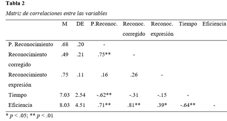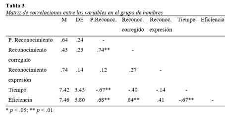 Por otro lado, en el grupo de mujeres no se halló una correlación negativa significativa entre tiempo y eficiencia, como ocurría con los varones. Estos resultados convergen con los obtenidos por Hall, Hutton y Morgan (2010) que encontraron que las mujeres eran más rápidas y precisas en el reconocimiento, observando relaciones positivas entre la precisión en el reconocimiento de la expresión facial y la velocidad de respuesta.