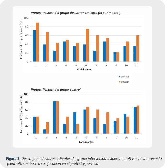 En la figura 1, se muestra el desempeño de los estudiantes de acuerdo con los resultados de las aplicaciones del pretest y postest. Se puede observar el incremento en tareas de comprensión de lectura de diez de los once participantes que integraron el grupo de entrenamiento. Se muestra el desempeño de los estudiantes del grupo no intervenido (control) y del grupo de entrenamiento (experimental), de acuerdo con los resultados de las aplicaciones del pretest y postest.