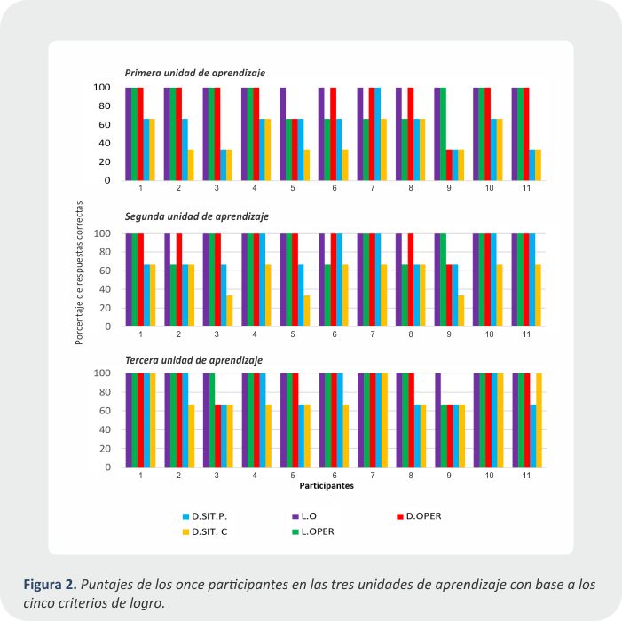 En cada una de las tres unidades de aprendizaje se realizaron tres ejercicios por criterio de logro que el estudiante podía satisfacer de acuerdo con los siguientes criterios de efectividad, puntuaba 0 si no realizaba el ejercicio, 1 si lo hacía suficientemente, 2 si lo hacía parcialmente y 3 si lo hacía correctamente.