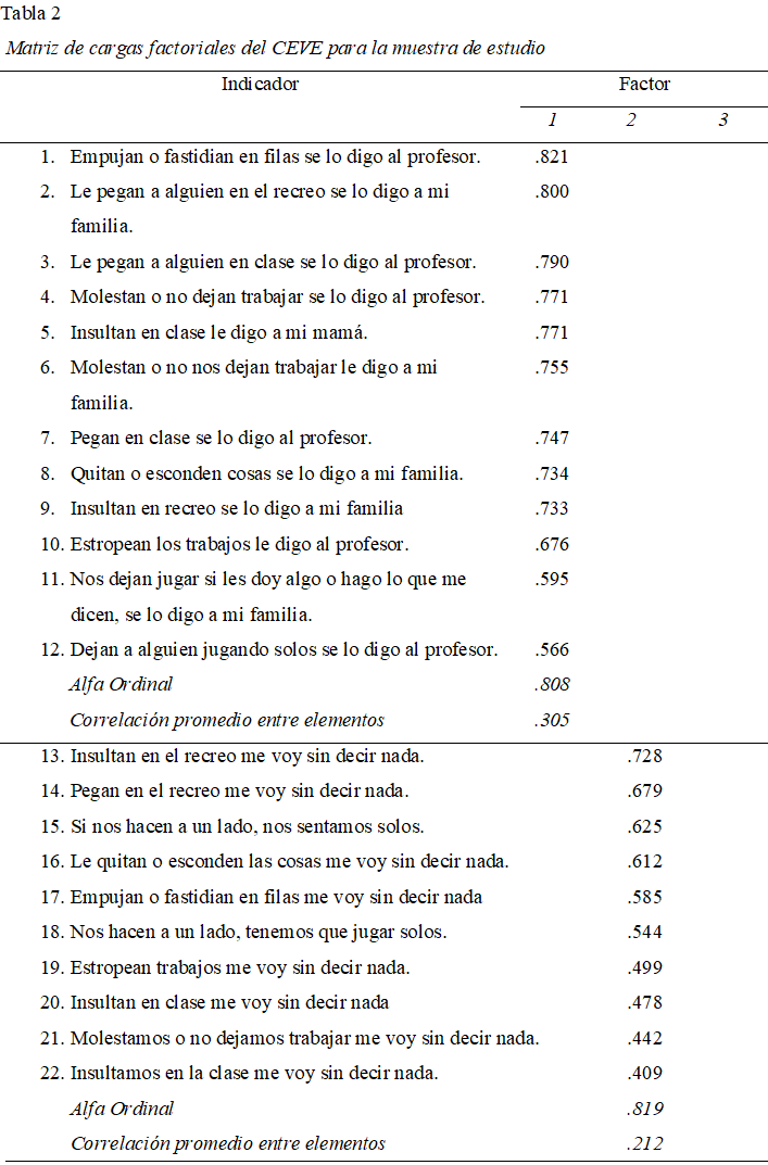 Los resultados demuestran consistencia con los estudios previos de Albaladejo-Blázquez et al (2013), en lo que corresponde a la estructura factorial inicial del CEVEIP, definida por tres factores: situaciones vividas, presenciadas y realizadas. Para el caso de la muestra obtenida del norte de México, las situaciones vividas obtuvieron una mayor varianza explicada, lo que implica un mayor peso e importancia en la definición de la violencia escolar a través del instrumento utilizado, en el caso del estudio citado, el factor con mayor carga fueron las situaciones presenciadas.
