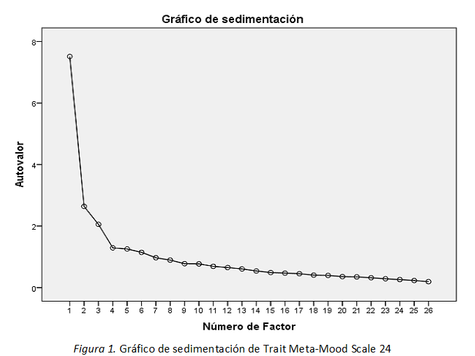 En cuanto la evidencia de validez relacionada a la estructura interna del Trait Meta-Mood Scale 24 (escala de Inteligencia Emocional), se realizó mediante un análisis factorial de tipo exploratorio. Específicamente, se realizó un análisis de factorización de ejes principales con rotación Oblimin para determinar la cantidad mínima de factores que explican la inteligencia emocional. En primer lugar, para verificar la pertinencia de este análisis. Se realizó la prueba de esfericidad de Barlett y la de KMO, con los cuales se verifican si los ítems de la prueba correlacionan entre sí, para lo cual debería haber una puntuación mayor a .70 para el KMO y la prueba de Barlett debe ser estadísticamente significativa (p <.05) (Lloret, Ferreres, Hernandéz & Tomás, 2014). Se obtuvo un KMO de .87 lo cual se considera aceptable. Además, la prueba de Barlett resultó estadísticamente significativa (p < .01; χ² = 2221,77; gl =276). Los resultados nos dan como conclusión que existe relación entre los ítems y por lo tanto es factible realizar el análisis factorial. En un segundo lugar, se realizó la primera extracción de ejes principales de la prueba. En un primer momento, esta estimación dio como resultado que el Trait Meta-Mood Scale 24, se componía de 5 factores con autovalores mayores que 1 y que en su conjunto explicaban el 50.96% de la varianza. Sin embargo, al revisar el gráfico de sedimentación de Cattell, este sugiere que 3 factores explicarían mejor el constructo. En ese sentido se optó por realizar un segundo análisis asumiendo 3 dimensiones tal como puede observarse en la Figura 1, y tal como lo sugiere la teoría del autor de la prueba.