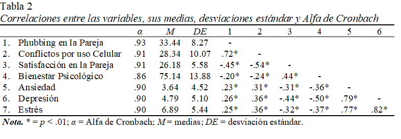Luego, realizamos análisis de correlación para todas las variables en nuestro estudio, calculamos los índices de consistencia interna y obtuvimos las medias y desviaciones estándar de las medidas (véase Tabla 2). Los análisis revelaron asociaciones significativas entre las dos medidas relacionadas al phubbing y todas las variables de salud mental y bienestar psicológico. Es decir, a mayor phubbing en la pareja, mayores conflictos por el uso del celular, menor satisfacción en la relación de pareja, menor bienestar psicológico y mayor salud mental negativa (ansiedad, depresión y estrés).