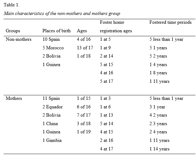 The sample consisted on 36 girls divided into two groups. The first group included 18 girls from two foster group homes (non-mother group), and the second group included 18 teen mothers from two foster group homes (mother group). The girls were between 15 and 19 years old. In the sample there were more Spaniard girls than foreigners. Most of the girls went to foster group homes after the age of 13. The main characteristics of the sample are summarized in table 1.