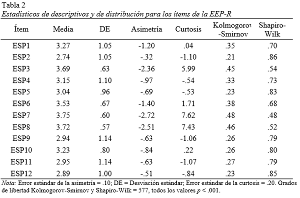 En primer lugar, obtuvimos las medias y desviaciones estándar para cada ítem de la EEP-R para analizar las propiedades de distribución de la escala. Las medias de los ítems fluctuaron entre 2.74 y 3.53, con desviaciones estándar que fluctuaron entre .57 y 1.14. Como muestra la Tabla 2, las pruebas de normalidad Kolmogorov-Smirnov y Shapiro-Wilk evidencian que los datos no se distribuyen de forma normal (p < .001). Por la falta de normalidad en los datos, utilizamos las correcciones de Satorra y Bentler (2001) para calcular el ajuste de los modelos de ecuaciones estructurales, ya que la no-normalidad de los datos altera los errores de estimación y el ajuste global del modelo.