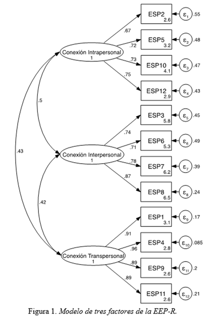 De forma general, el análisis factorial confirmatorio mostró que el modelo hipotetizado presentó un ajuste satisfactorio con los datos y confirmó la estructura multifactorial de la EEP-R, lo cual sugiere que la misma se ajusta adecuadamente a las dimensiones del Modelo Multidimensional de Conexión Espiritual (González-Rivera, 2017). Esto es congruente con los resultados obtenidos por González-Rivera et al. (2017), los cuales revelaron una estructura de tres factores: conexión intrapersonal (asociada a los aspectos existenciales de la espiritualidad como la búsqueda de sentido, significado, propósito y dirección en la vida), conexión interpersonal (asociada a los factores interrelaciones de la espiritualidad como el respeto, el amor, la compasión y la aceptación) y conexión transpersonal (relacionada con factores intangibles y transcendentales de la espiritualidad como la esperanza, la relación con un ser o fuerza superior y la búsqueda de lo sagrado). Estas dimensiones integran las creencias y practicas espirituales que puede tener un individuo.