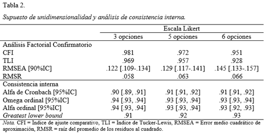 Los indicadores globales de consistencia interna mostraron índices altamente satisfactorios para los diferentes formatos de escala Likert sin evidenciar diferencias considerables entre ellos (tabla 2).