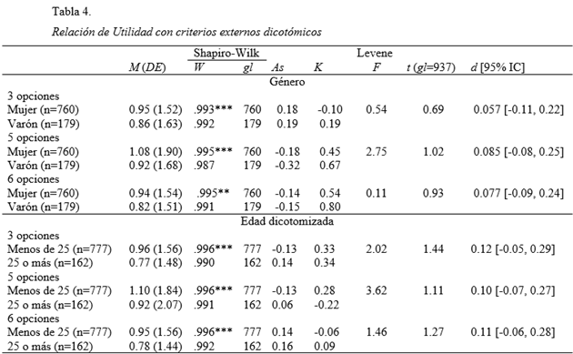 2) las evidencias de validez basadas en la relación entre el constructo Utilidad con otras variables externas.