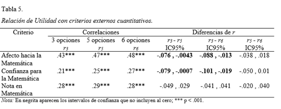 Los análisis efectuados para estudiar la relación de cada formato con criterios externos cuantitativos se exhiben en la tabla 5. En este caso, la comparación de los r para las diferentes escalas Likert se efectuó con un análisis más riguroso que el aplicado con los criterios dicotómicos en virtud de que existe un procedimiento más objetivo. Considerando los intervalos de confianza de la diferencia de dos r puede concluir que no se registran diferencias significativas en las correlaciones de los tres formatos con la calificación obtenida en Matemática. En cambio, las correlaciones del formato de tres opciones con las variables Afecto y Confianza fueron más débiles que las obtenidas con los θ estimados a partir de las escalas de cinco y seis categorías.