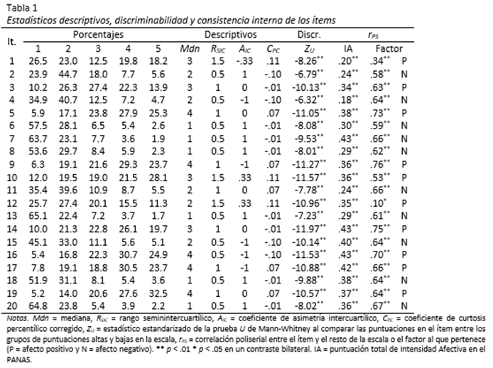 En relación con el primer objetivo sobre los ítems, se describieron sus distribuciones por medio de los porcentajes de respuesta a las categorías ordenadas, la mediana (Mdn), rango semiintercuartílico (RSIC), coeficiente de asimetría intercuartílico (AIC) y coeficiente de curtosis percentílico corregido o centrado en cero (CPC). Se comprobó la discriminabilidad de cada ítem por la comparación de las puntuaciones en el ítem entre los grupos de puntuaciones altas (≥ percentil 73) y bajas (≤ percentil 27) en la escala o suma de los 20 ítems (Kelley, 1939) a través de la prueba de la U de Mann-Whitney, así como la correlación policórica (rPC) del ítem con la escala dicotomizada en puntuaciones altas y bajas. El criterio de discriminabilidad fue una diferencia significativa y una correlación policórica mayor que .40 (Ebel, 1954). La consistencia interna se comprobó por la correlación entre el ítem y el resto de la escala o de su factor (excluido el ítem) a través del coeficiente de correlación poliserial (rPS). Una correlación poliserial significativa y mayor que .30 se tomó criterio de consistencia interna (Pedhazur & Schmelkin, 1991).