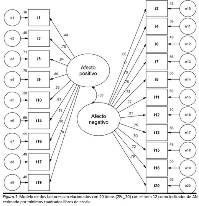 El modelo de dos factores correlacionados (2Fc_20) presentó cuatro índices con valores de buen ajuste, GFI, AGFI, NFI y CFI, dos con valores de ajuste aceptable, SRMR y RMSEA, y uno con valor de mal ajuste, χ2/gl. Además, tuvo una parsimonia alta y una relación parsimonia-ajuste buena por los tres índices parsimoniosos (Tabla 2). El factor de AP tuvo una consistencia interna excelente, ω = .90, y validez convergente, AVE = .51 y H = .93. La consistencia interna del factor de AN fue buena, ω = .85, y mostró validez convergente, AVE = .50 y H = .92 (Tabla 3). La varianza compartida entre ambos factores fue 10.8%, por lo que hubo validez discriminante entre ambos factores (Figura 1).