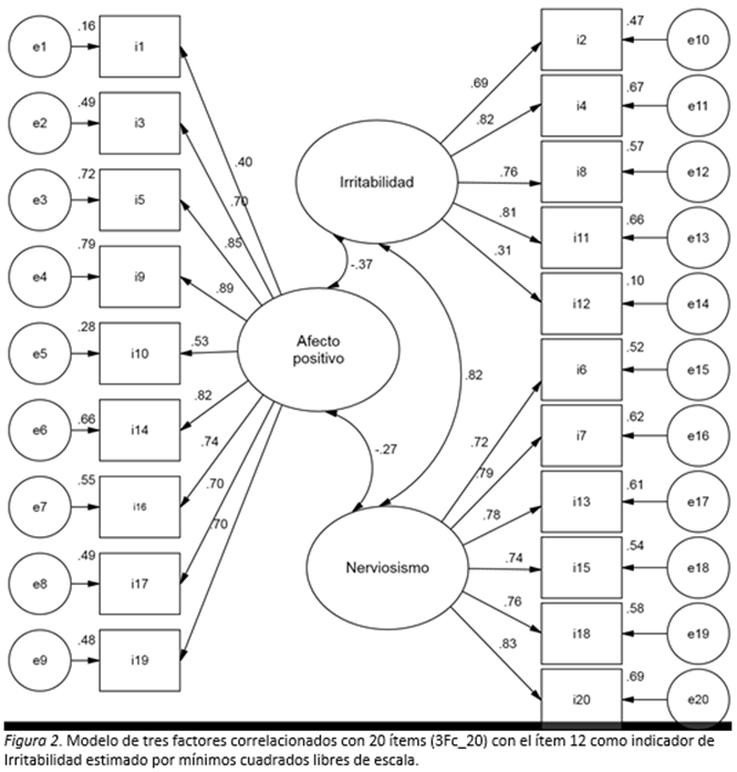 El modelo de tres factores tampoco fue sugerido por los criterios para determinar el número de factores, y al estimarlo se evidenció el motivo, la falta de validez discriminante entre los dos factores de afecto negativo (irritabilidad y nerviosismo), los cuales deberían definir un solo factor.