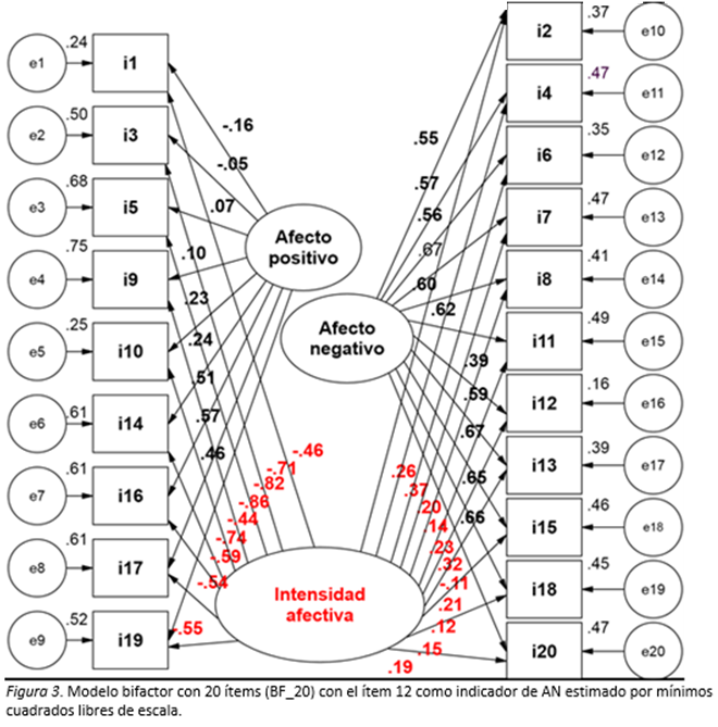 Cabe señalar que, en la elaboración de los ítems del PANAS (Watson et al., 1988), se incluyeron tanto estados emocionales (por ej., avergonzado, disgustado) como motivacionales (por ej., interesado, estimulado), lo que probablemente dificulta que el modelo bifactor represente bien la estructura subyacente, al no ser la interrelación alta. Precisamente, cuando se incluyen sólo ítems con contenido emocional, como en la escala de Diener et al. (2010), las correlaciones entre los ítems son altas o muy altas, así como entre los dos factores (Cassaretto & Martínez, 2017; Diener et al., 2010), lo que permitiría el modelo bifactor represente bien la estructura subyacente (Reise, 2012).