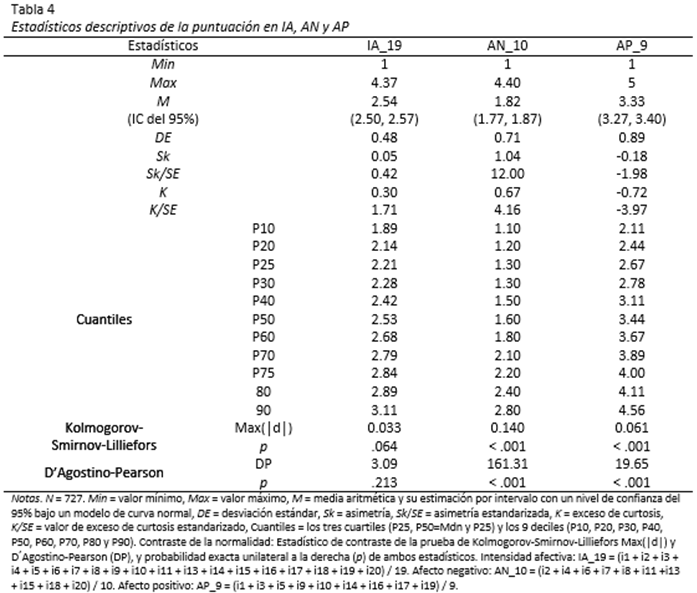 Desde investigaciones con jóvenes universitarios (Gargurevich & Matos, 2012; Medrano et al., 2015; Merz & Roesch, 2011; Watson et al., 1988), población general (Moriondo et al., 2012) y parejas (Moral, 2011), se esperaba una mayor proximidad a la normalidad en las distribuciones de la puntuación total y el factor de AP que del factor de AN. En la presenta muestra, la puntuación total de IA se ajustó a una distribución normal y el factor de AP presentó una mayor proximidad a la normalidad que el de AN, con lo que cumplieron las expectativas distribucionales en esta población.