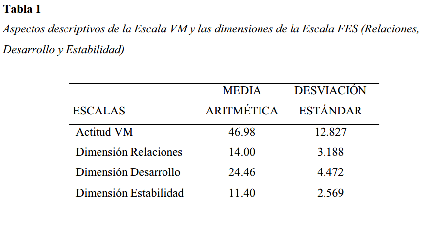 Según los resultados obtenidos, la Escala de Actitud VM se encuentra en un nivel medio (M = 46.98; Pc = 55), que refiere una actitud indiferente o neutra hacia la violencia contra la mujer en la relación de pareja (Chuquimajo, 2000). Por otro lado, respecto a la Escala de Clima Social Familiar, todas las dimensiones que conforman la escala se sitúan en un nivel o categoría promedio (Pc = 45).