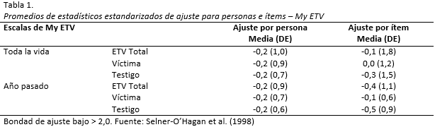 My Exposure to Violence (My ETV). El cuestionario Mi Exposición a Violencia (o My ETV por sus siglas en inglés) es un auto-reporte que da cuenta del grado de violencia al cuál han sido expuestos los sujetos. En su forma corta (empleada en este estudio) este instrumento consta de 23 ítems, 14 de los cuales dan cuenta de exposición del sujeto como testigo y 9 de exposición como víctima. En relación a sus propiedades psicométricas, trabajos previos indican una confiabilidad test – retest que oscila entre 0,75 y 0,94, así como un alfa de Cronbach de 0,68 a 0,93 (Posada y Wainryb, 2008; Posada, 2012). Ahora bien, el índice de bondad de ajuste de este instrumento fue determinado por Selner-O’Hagan, Kindlon, Buka, Raudenbush y Earls (1998) a través de un “estadístico estandarizado de ajuste” en un modelo Rasch de respuesta al ítem que comparó información de una muestra en dos momentos diferentes en el tiempo. Dicho estadístico consiste en la “media de los residuos estandarizados al cuadrado (observado – esperado) de las personas a través de los ítems o de los ítems a través de las personas.” (Selner-O’Hagan et al., 1998 p. 218). Así, se espera que los valores de las medias sea 0 (DE = 1) mientras que aquellos superiores a 2,0 son indicadores de un ajuste bajo. La Tabla 1 presenta los resultados obtenidos por Selner-O’Hagan et al. (1998) en relación al ajuste entre ítems y entre personas en las comparaciones hechas en los dos momentos en el tiempo. La evidencia soporta una adecuada bondad de ajuste para los ítems que componen el cuestionario de Mi Exposición a Violencia.