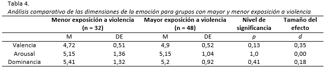 La Tabla 4 presenta los resultados obtenidos al comparar las tres dimensiones que componen el nivel verbal de la respuesta emocional en los grupos con mayor y menor exposición a situaciones violentas.