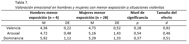 Se encuentra entonces una diferencia significativa en la dimensión de valencia entre hombres y mujeres (p < 0,05). Estos resultados son soportados por el valor del tamaño del efecto (0,61), el cual indica que dicha diferencia tiene un efecto moderado en función del tamaño de la muestra analizada. Por otra parte, las Tabla 6 y 7 permiten evidenciar los niveles de significación respecto a las diferencias entre hombres y mujeres con mayor y menor exposición a situaciones violentas respectivamente.