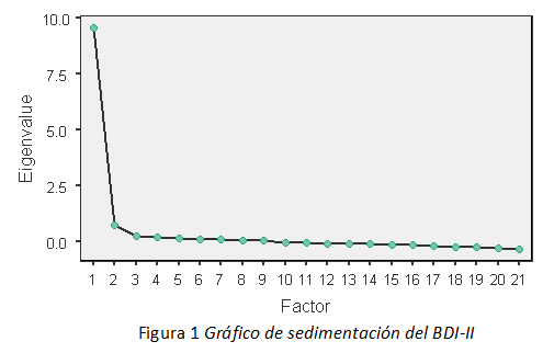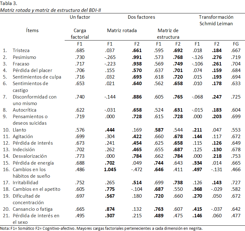 Para determinar la estructura factorial del BDI-II se optó por el análisis factorial exploratorio(AFE) y no por el confirmatorio (AFC), debido a la falta de antecedentes locales, por lo que consideramos prudente, primero, explorar su estructura, más aún teniendo en cuenta que el BDI-II, aparentemente, es inestable en el sentido de que, algunos ítems cargan más en el factor cognitivo-afectivo, y otras, estos mismos reactivos, muestran mayor carga factorial en la dimensión somática (del Pino et al. 2012). Los resultados iniciales del análisis factorial exploratorio sugirieron la existencia de un solo componente. No obstante, debido a que los estudios internacionales (Beck et al. 1996; Sanz & García-Vera, 2013; Sanz et al., 2003a; 2003b) y nacionales (Carranza, 2013; Rodriguez-Amaro & Daniel, 2015) apuntan a la existencia de dos factores, se hizo un segundo AFE, el cual mostró mejor ajuste que el primer modelo, coincidiendo con las investigaciones ya referidas. Además, las cargas factoriales en este estudio difieren de las investigaciones nacionales, confirmando lo planteado por del Pino et al. (2012), que no todos los ítems siempre pertenecen a la misma dimensión. Esto podría ocurrir debido a diferencias culturales (Prieto & Delgado, 2010) en la manifestación de los sintomas depresivos.