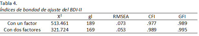 Asimismo, Rodriguez-Amaro y Daniel (2015) estudiaron las propiedades psicométricas del BDI-II en estudiantes de la ciudad de Huancayo. El análisis factorial exploratorio mostró dos factores con confiabilidad alta pues obtuvieron un α= .837 para la dimensión cognitivo-afectiva y α=.808 para la dimensión somática. El analisis factorial confirmatorio mostró indices de bondad de ajuste adecuados (X2 (151)= 210.898, CFI= .961, GFI= .931, RMSEA= .036, RMR= .027) para el modelo de dos factores correlacionados.