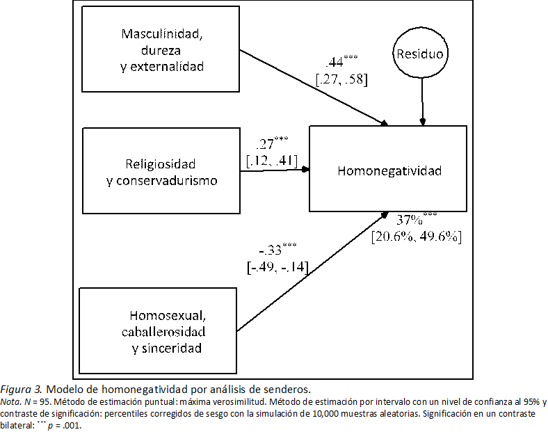 Con estas puntuaciones en los componentes se calculó un modelo de regresión lineal múltiple para predecir la puntuación total de la HN-16 por el método de entrada. El modelo fue significativo (F[3, 91] = 18.194, p < .001), con una potencia de .99 para un nivel de significación de .05, y explicó el 35.4% de la varianza de la puntuación total de la HN-16. Los tres predictores fueron significativos, siendo la potencia del contraste alta. Mayores niveles de masculinidad-dureza-externalidad y religiosidad-conservadurismo predijeron mayor nivel de homonegatividad. Por el contrario, homosexualidad-caballerosidad-sinceridad predijo menor nivel de homonegatividad. El tamaño del efecto de masculinidad-dureza-externalidad y homosexualidad-caballerosidad-sinceridad fue mediano, y el de religiosidad-conservadurismo pequeño (Tabla 5).