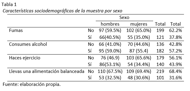 Se encontró que el 40.5% de los hombres fuma, el 59.0% consume alcohol, el 53.1% hace ejercicio y el 32.5% respondió que lleva una alimentación balanceada. Respecto a las mujeres el 35% fuma, el 55.4% consume alcohol, el 34.4% hace ejercicio y el 30.6 % mencionó que lleva una alimentación equilibrada.