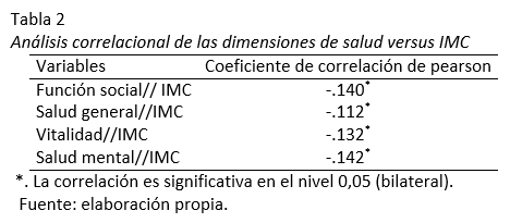 Según se observa en la tabla 2, existe una relación significativa inversa entre las dimensiones: salud e índice de masa corporal, lo que permite afirmar que; a) estudiantes con un bajo IMC tienen una mejor función social (interferencia de la salud física y emocional en la vida social). b) estudiantes con mejor estado de salud general presentan menor IMC. c) la salud mental mejora en la medida en que disminuye el IMC y d) la vitalidad de los estudiantes aumenta en función de la disminución del IMC.